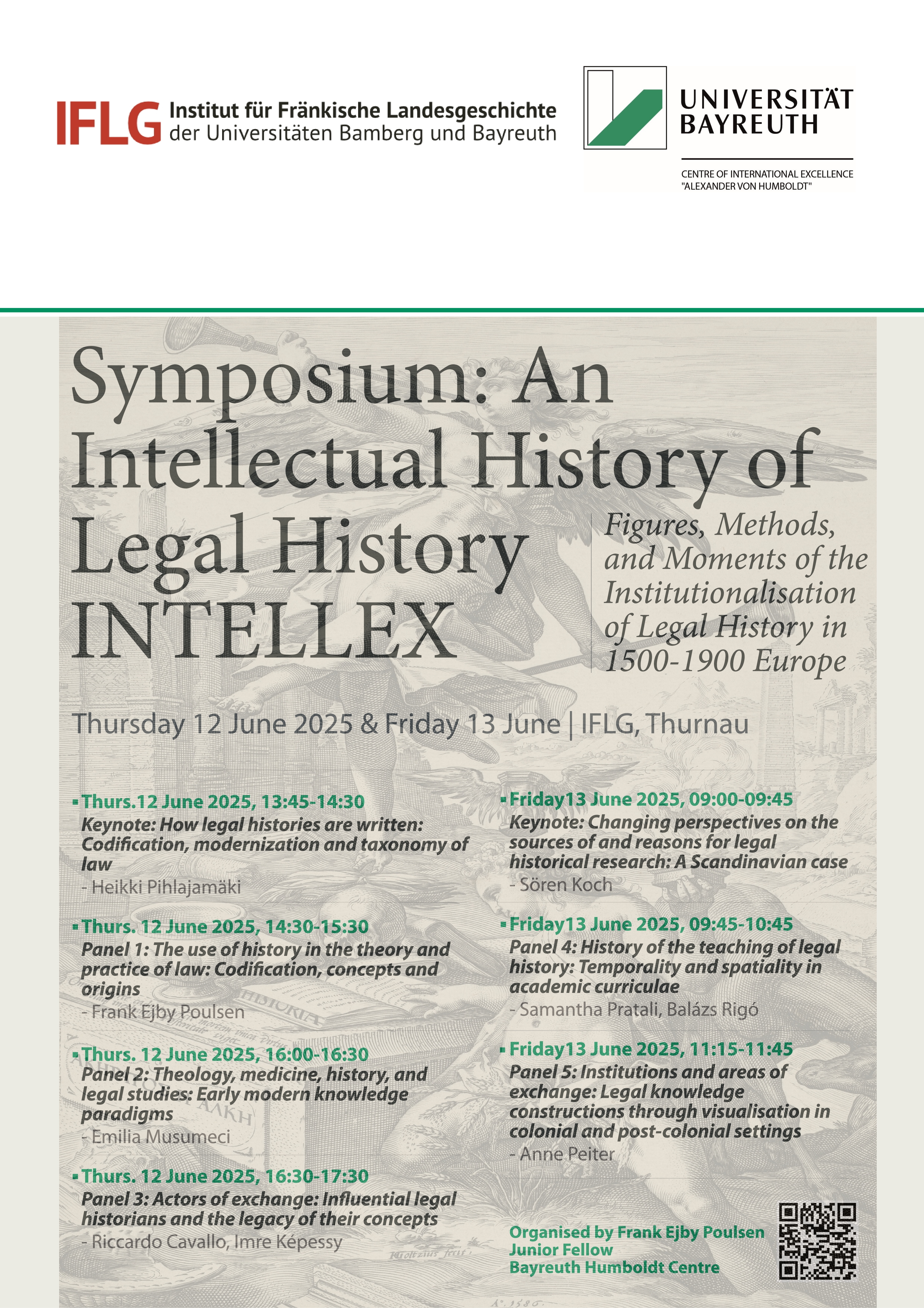 I am delighted to advertised the symposium on “An Intellectual History of Legal History (INTELLEX)” that I am organising on 12-13 June 2025 at the Institut für Fränkische Landesgeschichte (IFLG) der Universitäten Bamberg und Bayreuth. Keynote speakers are: Heikki Pihlajamäki and Sören Koch. The symposium is made possible thanks to a Junior Fellowship from the Humboldt Centre University of Bayreuth. The event will be hybrid with the possibility to stream online (more info will follow for the link and registration). Scan the QR code for more info or go to the event page. Please share with your network.