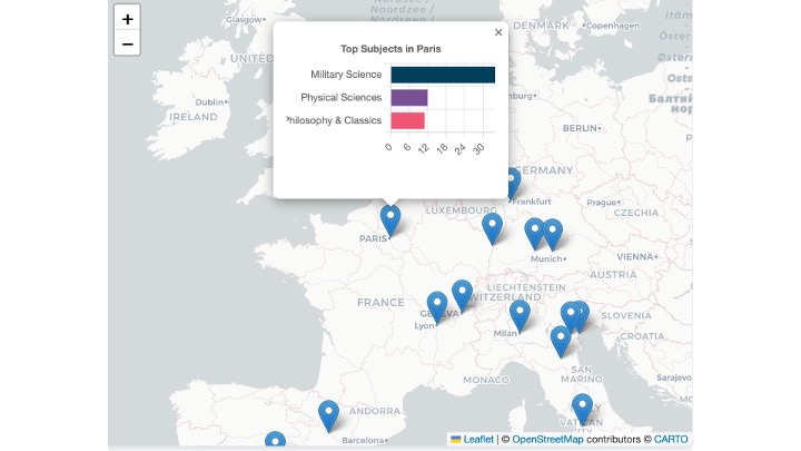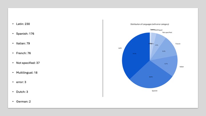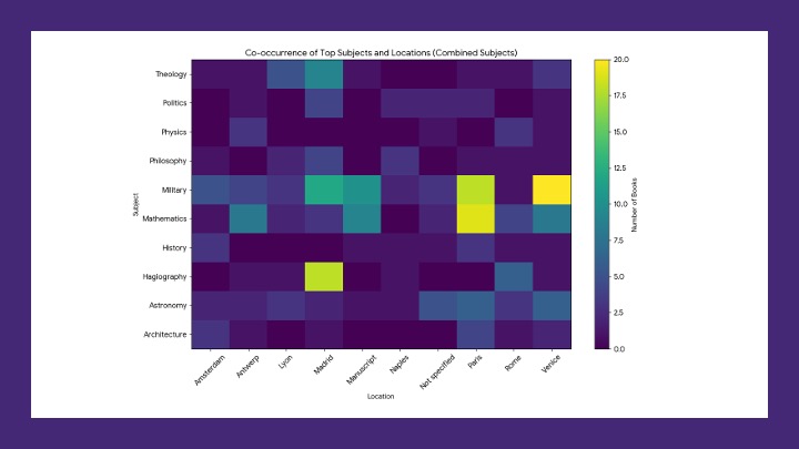 - Mapping a European Republic of Letters: The data reveals a clear linguistic and geographic logic. Latin was the language of choice for more abstract, academic works, while vernacular languages (Spanish, Italian, French) were used for practical, hands-on manuals. Furthermore, we can map the hubs of European printing for different subjects in this library: Paris was the centre for mathematics, Venice for military texts, and Madrid for hagiographies and religious works.